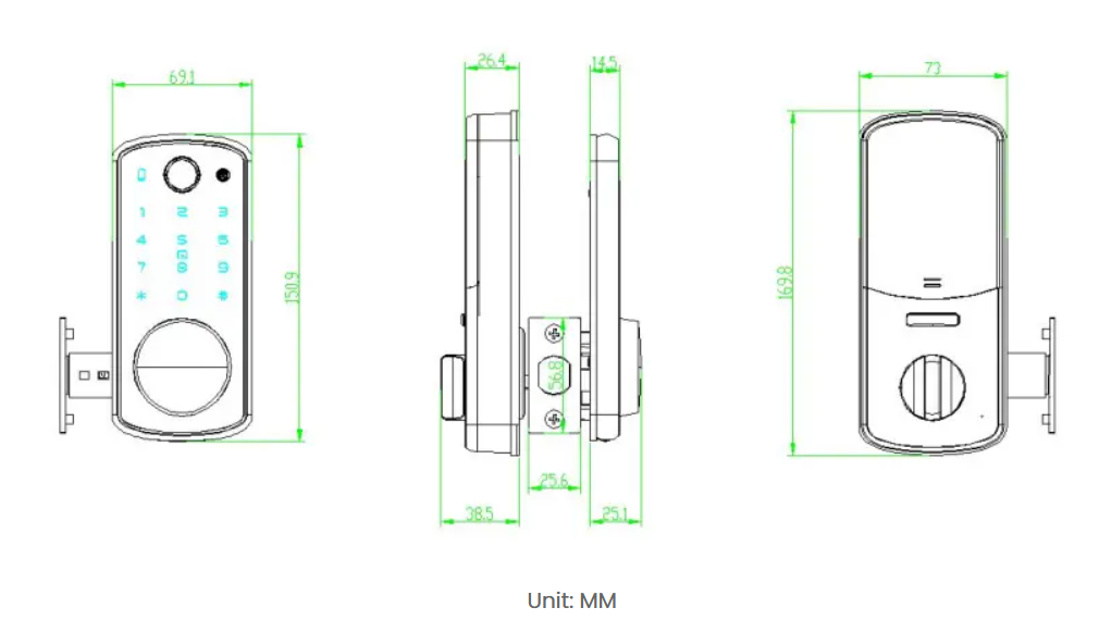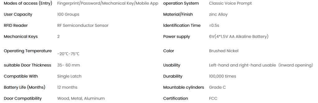 Different colors represent different states of the door lock. The low battery indicator reminds the user to replace the battery in time. Voice operation is convenient and quick. Equipped with a semiconductor fingerprint sensor to make your home safer. Good at distinguishing fake fingerprints and shallow fingerprints. The recognition time is less than 0.5 seconds, up to 100 fingerprints.